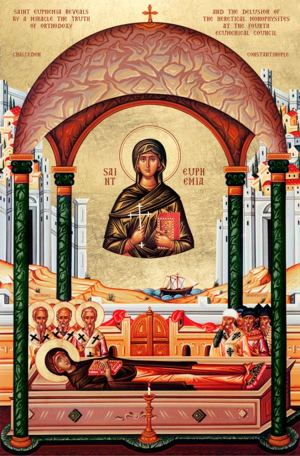 Показвайки силата на вярата си, ти, боголюбива Евфимия, заедно със своите сподвижници, като овца, водена на заколение, без страх застана пред своя мъчител, готова дори до кръв да пострадаш за твоя Господ. Затова, като виждаме твоята твърдост, те възхваляваме с такива песни: